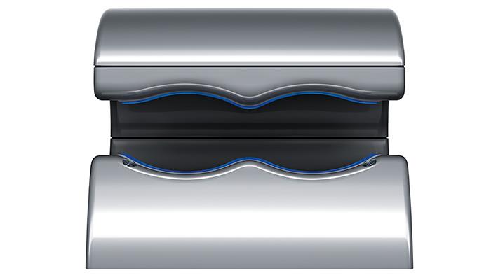 Este es el secador de manos Dyson Airblade dB. Cada segundo, aspira hasta 28 litros (7.40 gal/s) de aire filtrado con filtros HEPA a través de aperturas de hasta 0,8 mm de ancho. El resultado son láminas de aire a